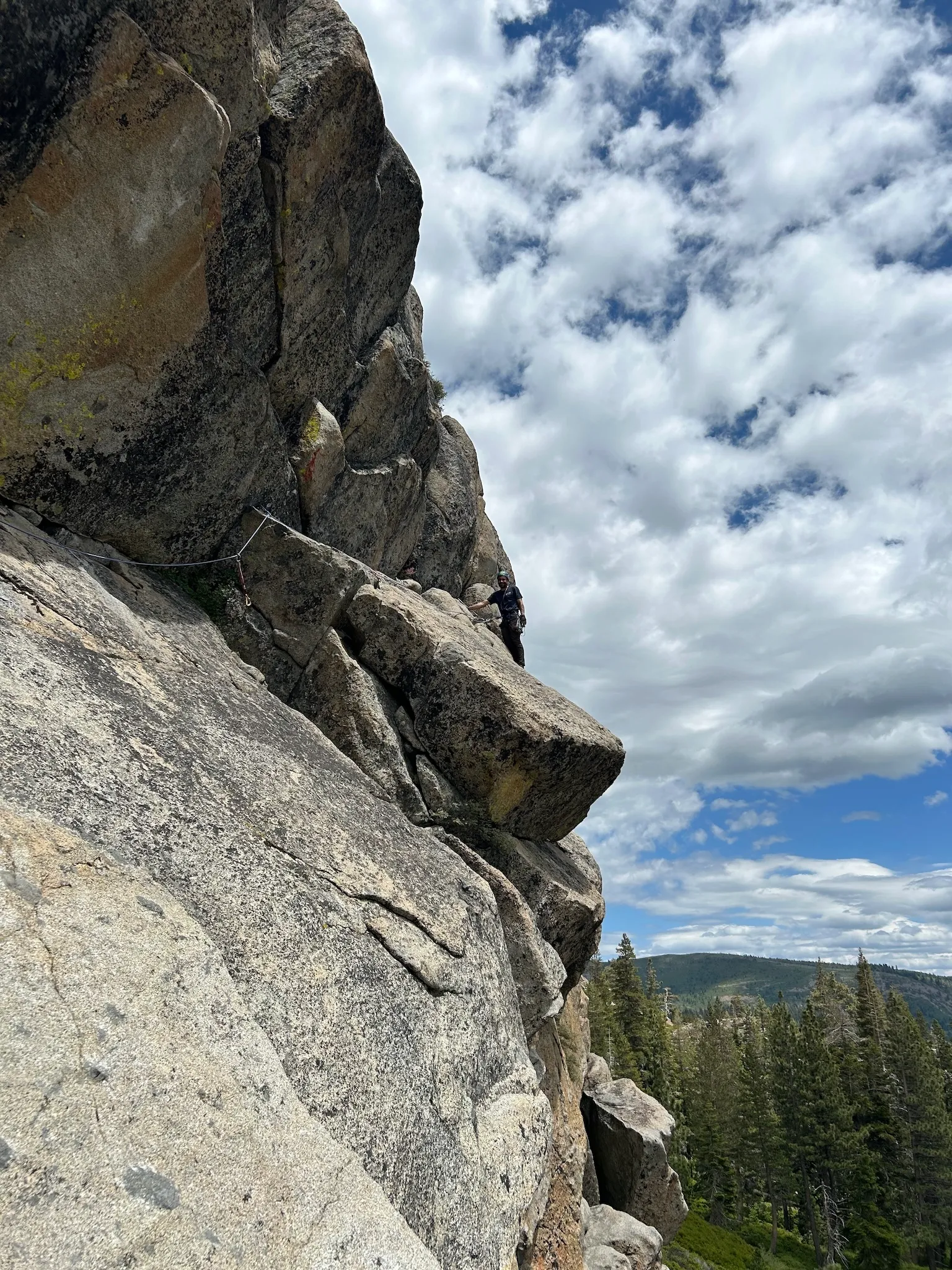 Although the climbing looks easy—shuffling right across a thin, consistent ledge halfway up the ramp—the fall consequences make this one of the scariest trad pitches I’ve led.