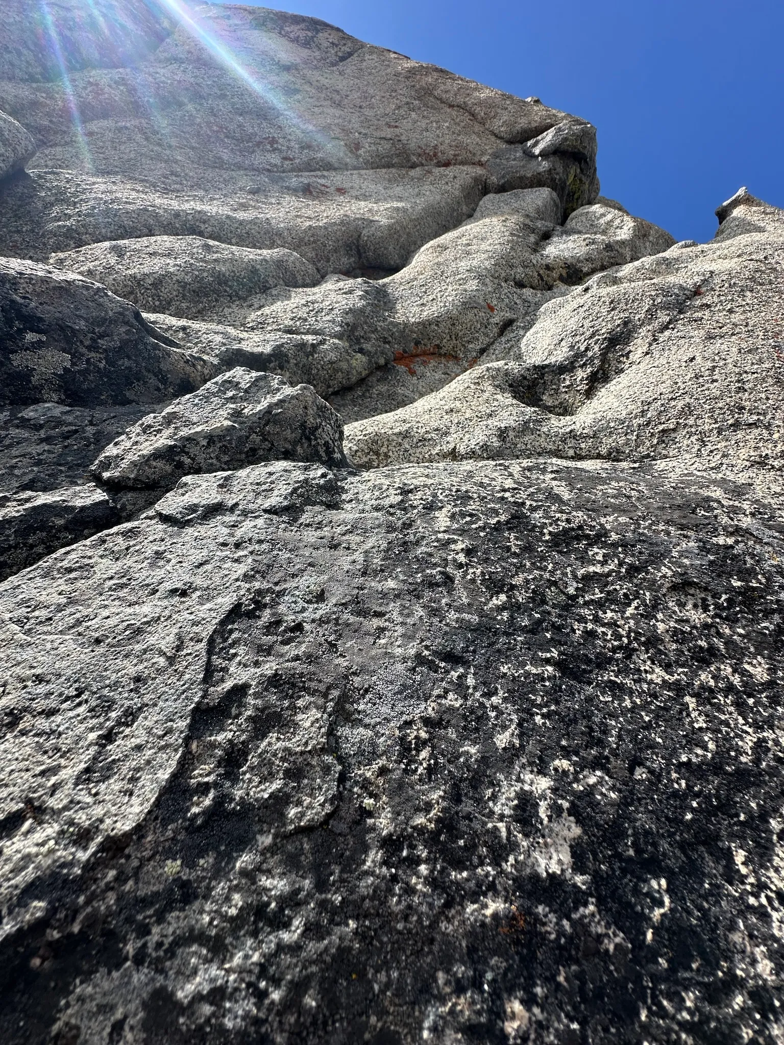 Two other features make this particular intimidating: there’s almost nowhere to place protection, and if I slip, I’ll slide right down that ramp into a pit of sharp, broken boulders beneath.