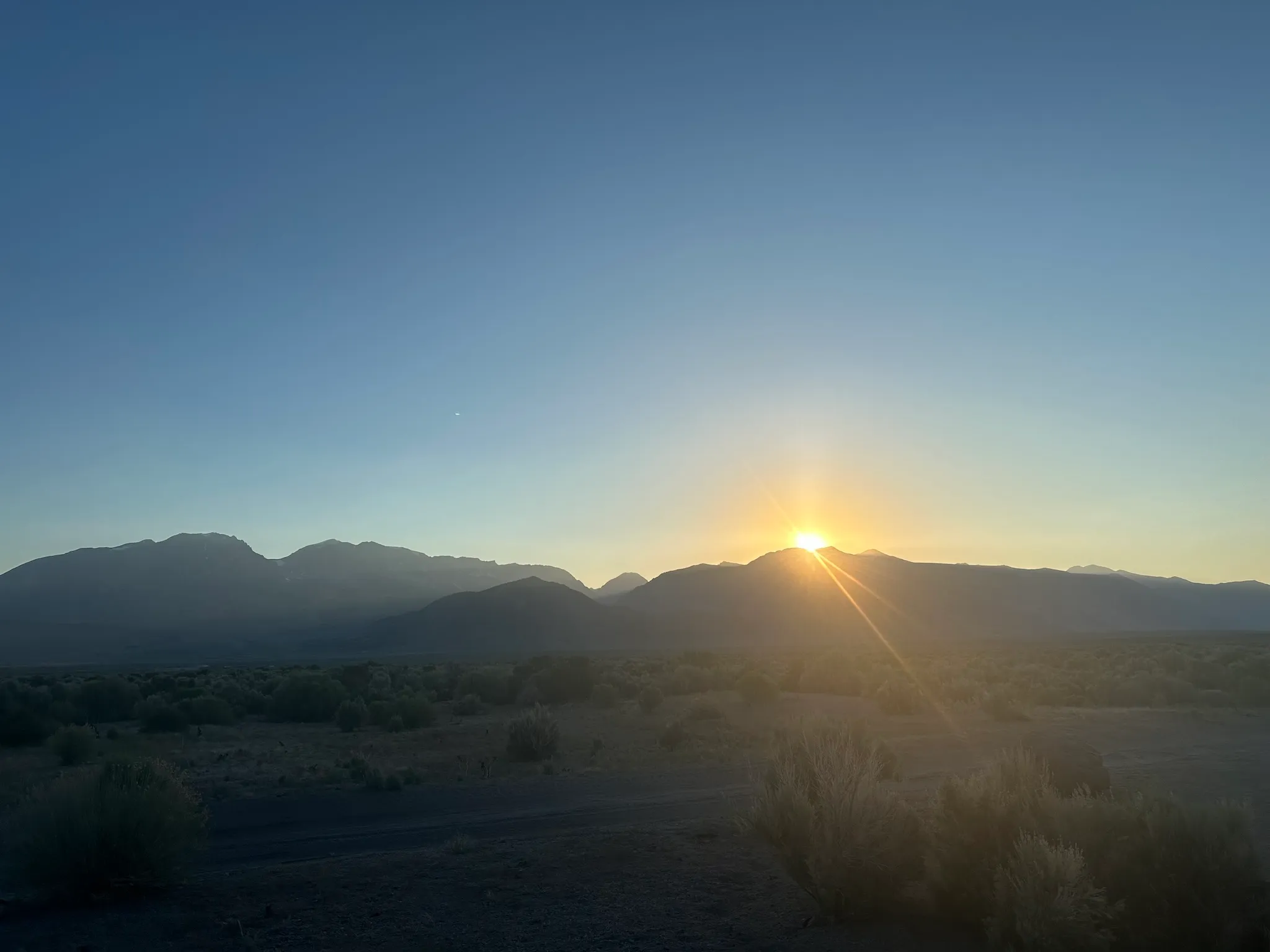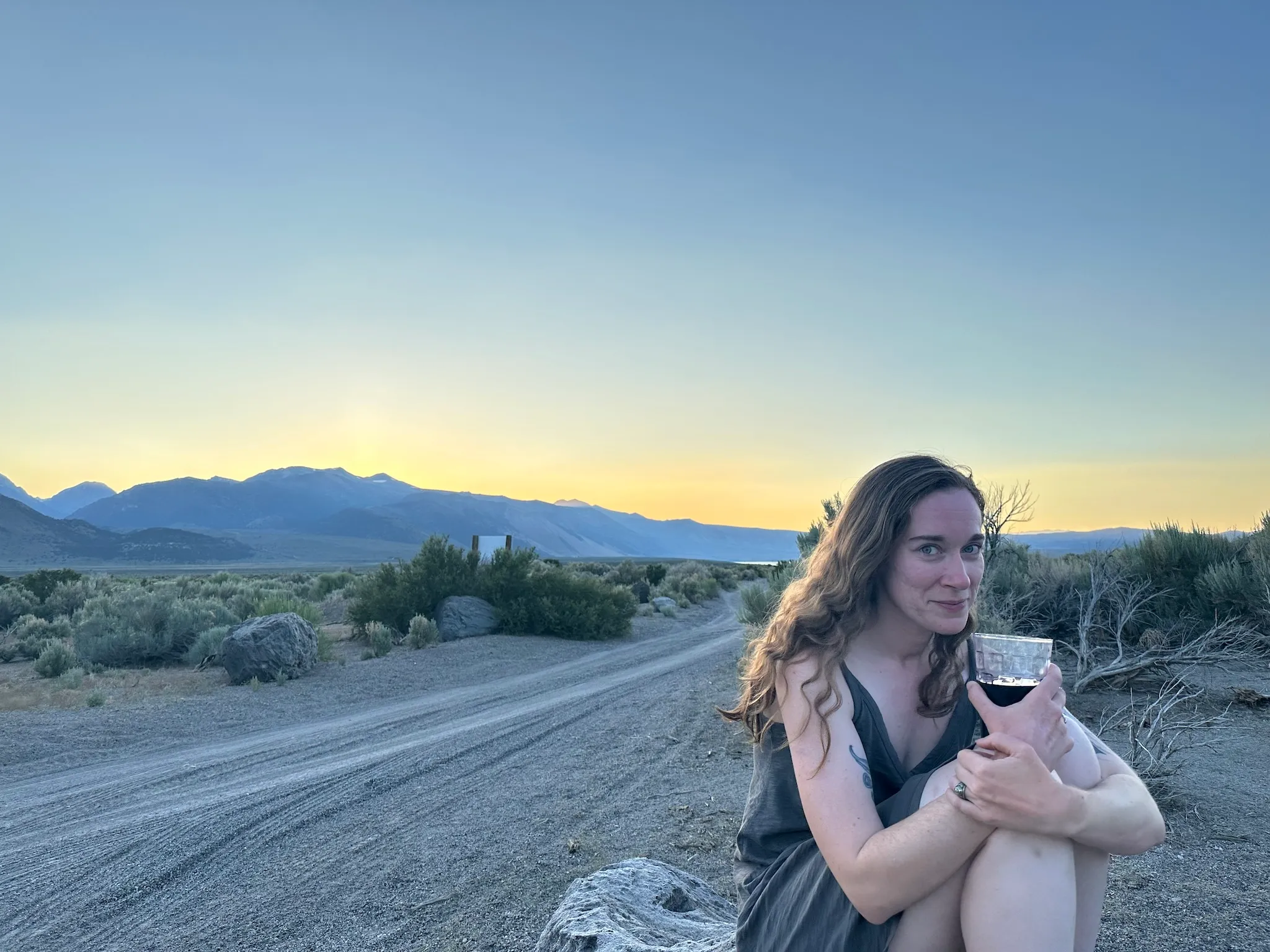 We depart early to find a dispersed campsite. A helpful app leads us into the Inyo National Forest, which doesn’t look much like a forest at all; it’s a bleak landscape of gravel, dirt, and desert shrubs. I feel cranky. I don’t want to camp in a dirt patch in the desert, but that’s exactly where we end up.