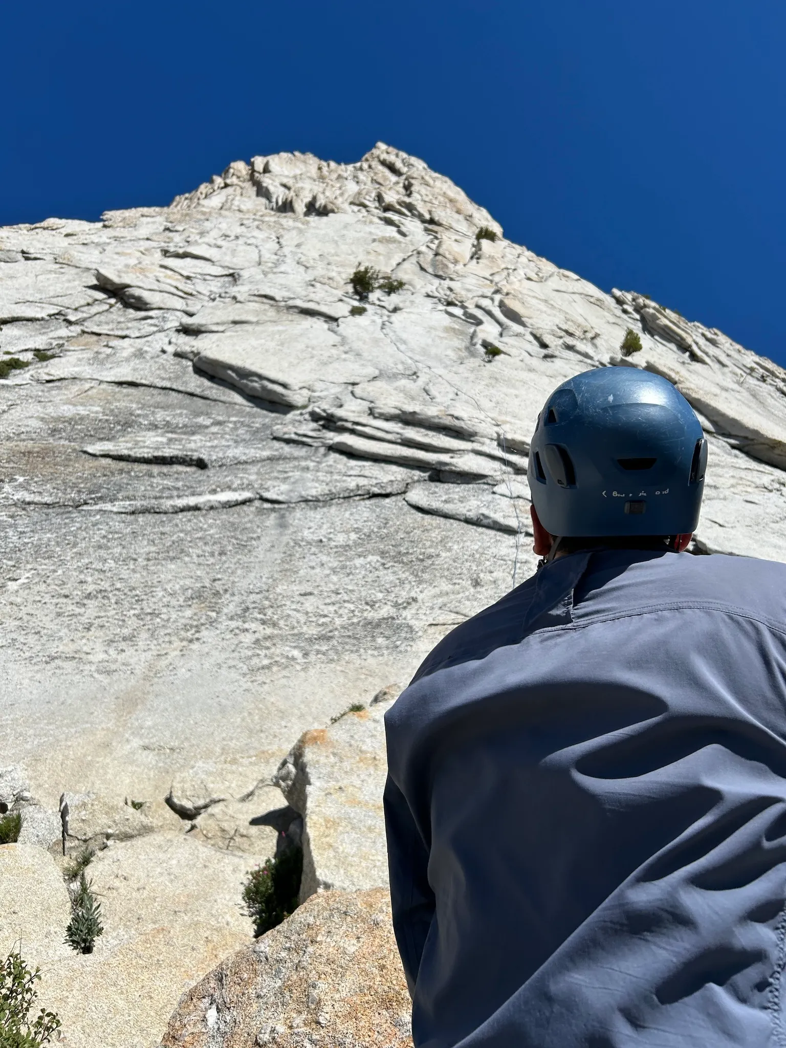 The approach trail is easier than Tenaya. The length and grade feel comparable, but the trail is well-groomed and the mosquitos are marginally better. Still, it’s a workout. We stop to refill water where the trail approaches the river, then make the last strenuous hike up to the base of the peak. We’re huffing and puffing by the time we arrive. Climbing, ironically, will feel easier.