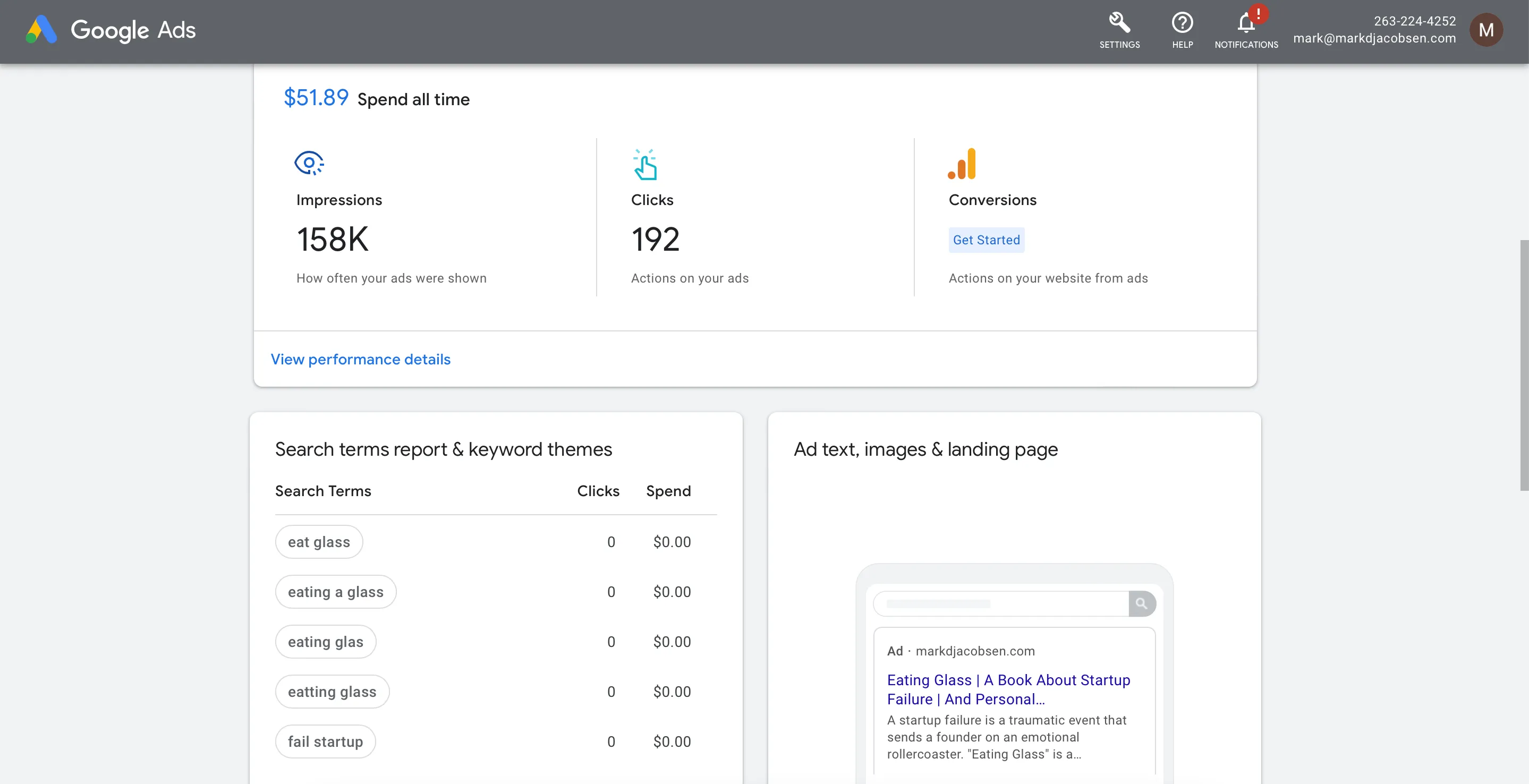 Later, I tried using Google ads. I triggered these ads to appear for terms like “startup failure”, “founder depression”, and so forth, thinking these would lead to the exact niche I wanted to target. I was a little amused when, a few days in, Google’s dashboard informed me that most people were finding my ads by googling terms like “can you eat glass.” I did my best to exclude glass-eater terms but I’m not sure this ever fully worked; Google’s ad dashboard is highly opaque. By the time I was done experimenting, 158,000 people had seen my ads and 192 had clicked the link, which took them to my book’s Amazon page. However, zero of those 192 purchased the book.