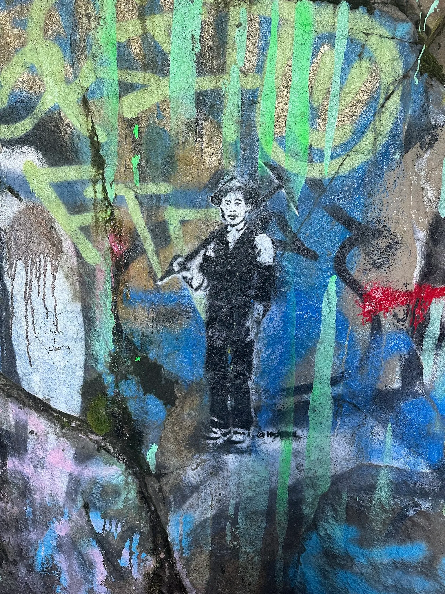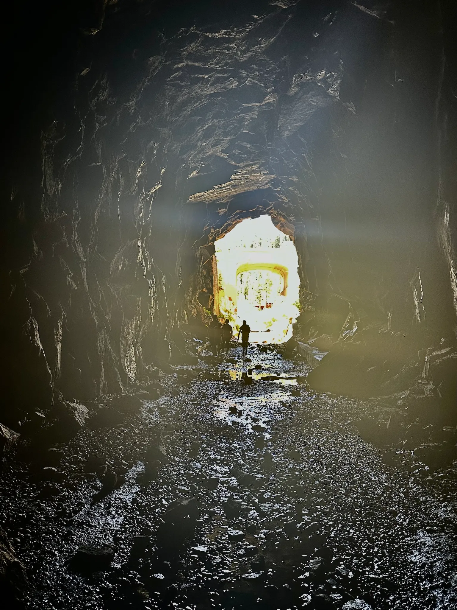 The first tunnel feels the oldest: a black maw blasted and carved out of the mountain, leaving blocky unfinished edges behind. It took an entire crew of Chinese railroad workers a full day to advance a few inches. The floor is uneven. A trickle of water dribbles through. We sweep our flashlights over the walls, studying the graffiti, which is appalling but also breaks up the endless, monotonous dark. Endless names and initials. “JESUS” and a cross, Christian vandalism, always amusing. BUSH DID 9/11. TRANS IS BEAUTIFUL.