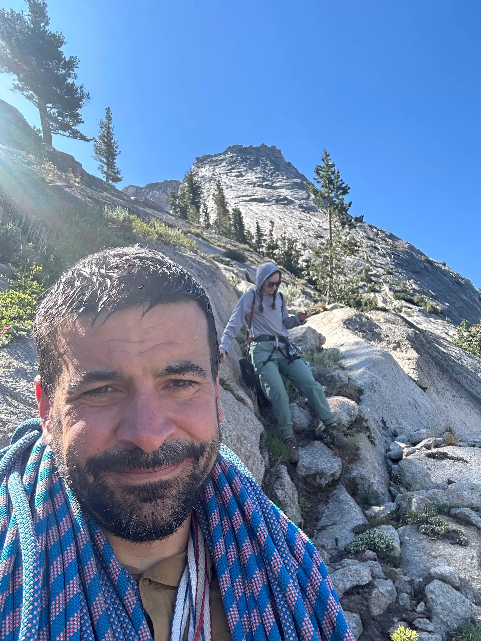 Tenaya Peak is immense, shining white overhead. It evokes my feelings of looking up El Captain. It’s only half as tall, but that’s still huge. Unlike El Capitan, which is starkly vertical, this granite sea is sloped, which is what supposedly makes the climb accessible to someone like me. Despite the peak’s formidable size, I feel good. We can do this.